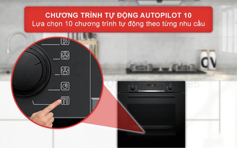 Sau khi bạn cho thức ăn cần chế biến vào bên trong lò nướng Bosch HBA5360B0K. Tiếp theo bạn chỉ việc nhấn vào biểu tượng AutoPilot 10 và chọn chương trình mong muốn bằng cách xoay núm cảm ứng. Tính năng AutoPilot 10 sẽ mang đến cho bạn 10 chương trình khác nhau tha hồ lựa chọn: