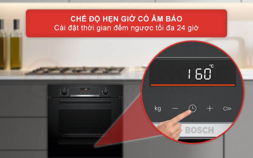 Có thể cài đặt hẹn giờ tối đa khi sử dụng lò nướng Bosch HBA5360B0K serie 6 lên đến 24h. Sau khi người dùng thực hiện cài đặt thì thời gian sẽ được đếm ngược về 0. Đồng thời, một biểu tượng thời gian cũng sẽ hiển thị trên màn hình trong quá trình đếm ngược.