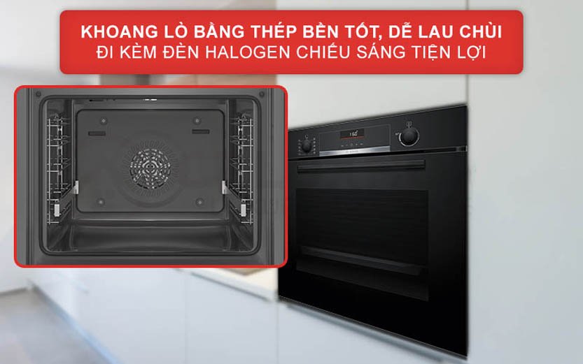 Chất liệu của khoang lò nướng Bosch HBA5360B0K được làm từ thép không gỉ được tráng men có thể chống bám dính dầu mỡ. Và giúp vệ sinh trong lò được dễ dàng hơn.