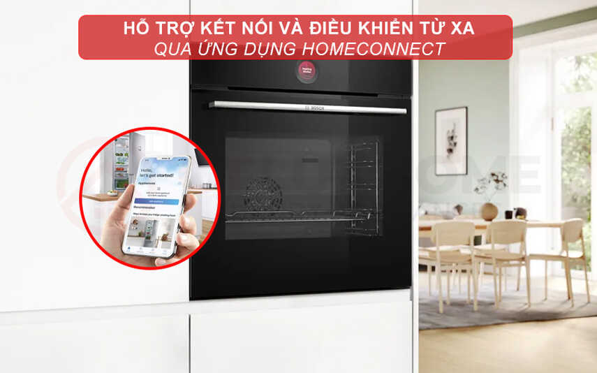 - Hỗ trợ kết nối và điều khiển từ xa nhờ ứng dụng Home Connect: cho phép bạn điều khiển từ xa qua điện thoại hoặc máy tính bảng. Bạn có thể chọn chế độ nướng, cài đặt nhiệt độ, và kiểm tra trạng thái thiết bị ngay cả khi không ở gần bếp. Đây là giải pháp hiện đại, đáp ứng nhu cầu nấu ăn linh hoạt cho các gia đình bận rộn.