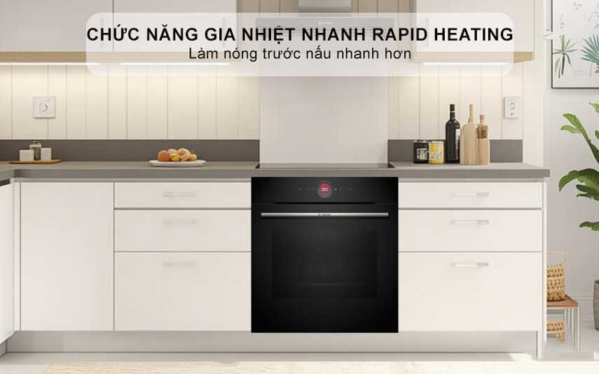 Bạn có thể tiết kiệm thời gian hiệu quả với chức năng gia nhiệt nhanh Rapid Heating của lò nướng Bosch HBG7741B1. Khi được kích hoạt, khoang lò sẽ nhanh chóng đạt đến nhiệt độ cài đặt, giúp rút ngắn thời gian chờ trước khi nướng. Lưu ý, chế độ Rapid Heating chỉ nên sử dụng khi nướng ở nhiệt độ từ 100°C trở lên để đảm bảo hiệu quả tối ưu.