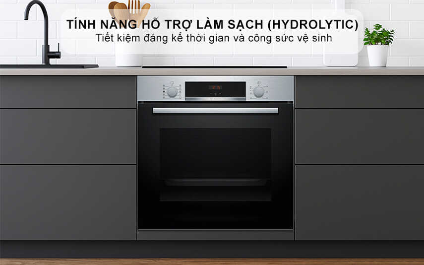 - Lò nướng Bosch HQA514ES3 được trang bị chế độ làm sạch Hydrolytic hiện đại, giúp việc vệ sinh trở nên đơn giản và nhanh chóng hơn. Người dùng chỉ cần đổ một ít nước vào khay, chọn chức năng làm sạch, hơi nước sẽ bốc lên, làm mềm và đánh bay các vết dầu mỡ, cặn bẩn bám trên khoang lò. Sau đó, chỉ cần lau nhẹ bằng khăn mềm là lò sẽ sạch bóng như mới, tiết kiệm thời gian và công sức đáng kể.