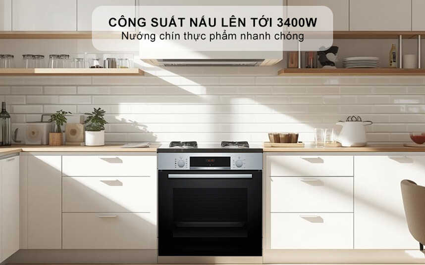 Lò nướng Bosch HBA514BS3 sở hữu công suất mạnh mẽ lên đến 3400W, giúp làm nóng nhanh chóng và duy trì nhiệt độ ổn định trong suốt quá trình nấu nướng. Nhờ hiệu suất cao, lò có thể nướng chín đều các nguyên liệu có kích thước lớn trong thời gian ngắn, đồng thời tiết kiệm đáng kể điện năng, mang đến trải nghiệm nấu nướng nhanh gọn và hiệu quả cho người dùng.