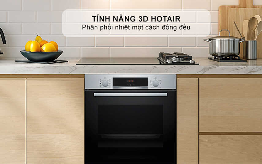 - Công nghệ 3D Hot Air trên lò nướng Bosch HQA514ES3 giúp luân chuyển không khí nóng đồng đều khắp khoang lò, đảm bảo thực phẩm được nấu chín đều ở mọi vị trí. Nhờ đó, món ăn đạt độ vàng giòn hấp dẫn bên ngoài và mềm mọng bên trong mà không cần xoay khay trong quá trình nướng, mang lại sự tiện lợi và hiệu quả vượt trội cho người dùng.