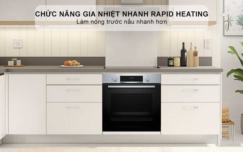 - Chức năng Rapid Heating (gia nhiệt nhanh) giúp rút ngắn đáng kể thời gian làm nóng lò, mang lại sự tiện lợi tối đa cho người nội trợ bận rộn. Khi kích hoạt chế độ này và đặt nhiệt độ trên 100°C, lò sẽ bắt đầu gia nhiệt chỉ sau vài giây, giúp đạt mức nhiệt mong muốn nhanh chóng. Nhờ đó, người dùng có thể bắt đầu nấu nướng ngay mà không phải chờ đợi lâu.