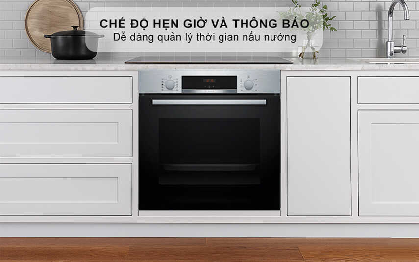 - Lò nướng Bosch HQA514ES3 dung tích 71L sở hữu chức năng hẹn giờ tiện lợi, cho phép người dùng cài đặt thời gian nướng chính xác cho từng món ăn. Nhờ vậy, bạn hoàn toàn yên tâm khi vừa nấu nướng vừa làm các công việc khác trong bếp mà không cần phải theo dõi liên tục.