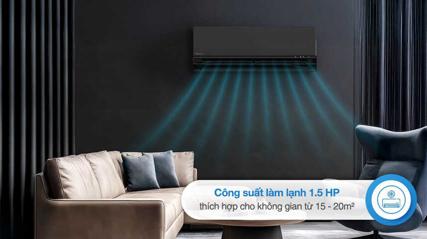 Công suất 1.5 HP (11.900 BTU), thiết kế màu đen sang trọng phù hợp phòng từ 15 đến 20m².