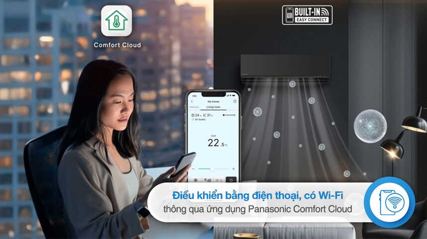 Bên cạnh đó, máy còn kết nối Wi-Fi và tương thích với ứng dụng Panasonic Comfort Cloud, cho phép bạn quản lý và điều khiển từ xa bằng điện thoại. Dù ở ngoài nhà, bạn vẫn có thể bật máy trước khi về hoặc kiểm soát mức tiêu thụ điện một cách chủ động và tiết kiệm hơn.