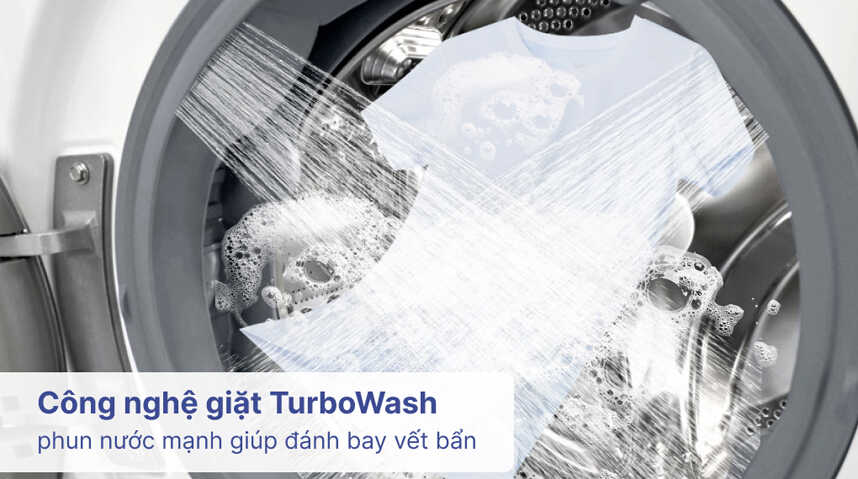 - Công nghệ giặt TurboWash giúp rút ngắn thời gian giặt mà vẫn đảm bảo hiệu quả làm sạch. Nhờ hai vòi phun nước mạnh mẽ, áp lực nước được tăng cường, giúp bột giặt thẩm thấu nhanh vào sợi vải và cuốn trôi bụi bẩn hiệu quả. Công nghệ này không chỉ giúp tiết kiệm thời gian mà còn giảm đáng kể lượng điện và nước tiêu thụ trong suốt quá trình sử dụng.