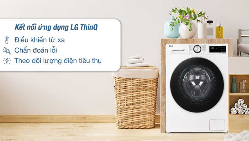 - Kết nối thông minh LG ThinQ – Điều khiển máy giặt mọi lúc, mọi nơi: Máy được tích hợp ứng dụng LG ThinQ, cho phép người dùng kết nối và điều khiển máy giặt từ xa bằng điện thoại thông minh. Bạn có thể khởi động hoặc tạm dừng chu trình giặt, theo dõi tiến trình, tải thêm chương trình giặt mới hoặc nhận thông báo khi giặt xong. Đây là tính năng tiện lợi giúp người dùng quản lý thời gian hiệu quả hơn, đặc biệt phù hợp với nhịp sống bận rộn ngày nay.