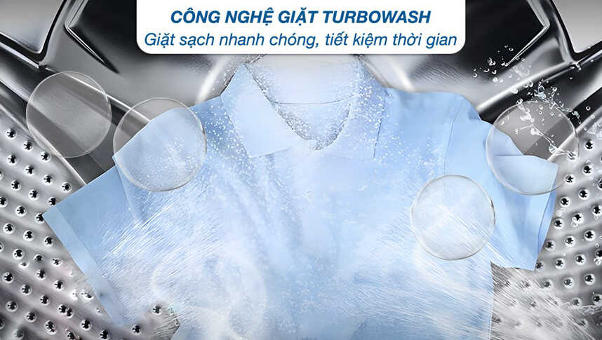 - Công nghệ giặt TurboWash sử dụng hai vòi nước áp lực mạnh, giúp nước giặt thẩm thấu sâu vào từng sợi vải, đánh bay vết bẩn cứng đầu một cách hiệu quả. Nhờ quá trình giặt diễn ra nhanh chóng hơn, công nghệ này không chỉ giúp tiết kiệm thời gian giặt giũ mà còn giảm tiêu thụ điện và nước, mang lại hiệu quả giặt sạch tối ưu cho gia đình.