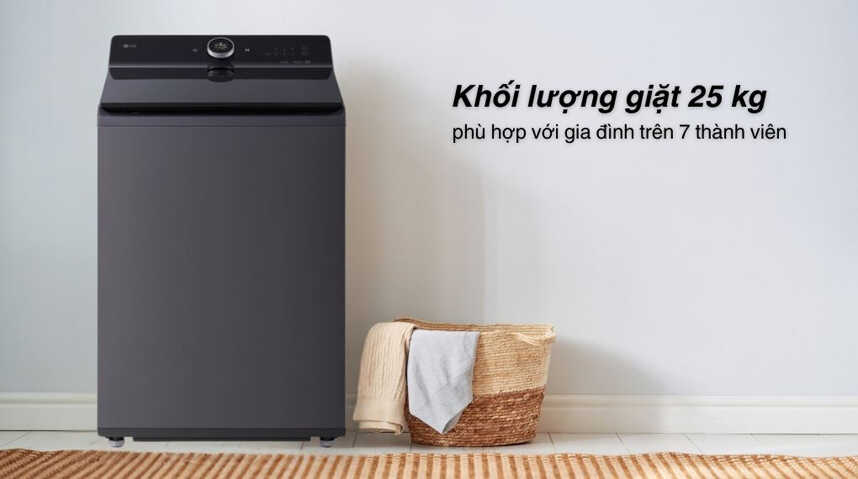 - Máy giặt LG AI DD T2725SX5G sở hữu khối lượng giặt lớn lên đến 25kg, đáp ứng hoàn hảo nhu cầu giặt giũ của gia đình đông thành viên hoặc giặt các vật dụng cỡ lớn như chăn, ga, rèm cửa. Bên cạnh đó, máy được trang bị nhiều chương trình giặt đa dạng, phù hợp cho từng loại vải và mức độ bẩn khác nhau, giúp người dùng dễ dàng lựa chọn chế độ tối ưu. Nhờ đó, quần áo luôn được giặt sạch hiệu quả, tiết kiệm thời gian và công sức.