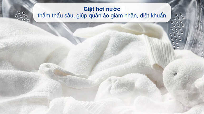 Công nghệ giặt hơi nước Steam giúp loại bỏ các tác nhân gây dị ứng, đảm bảo quần áo sạch sâu.