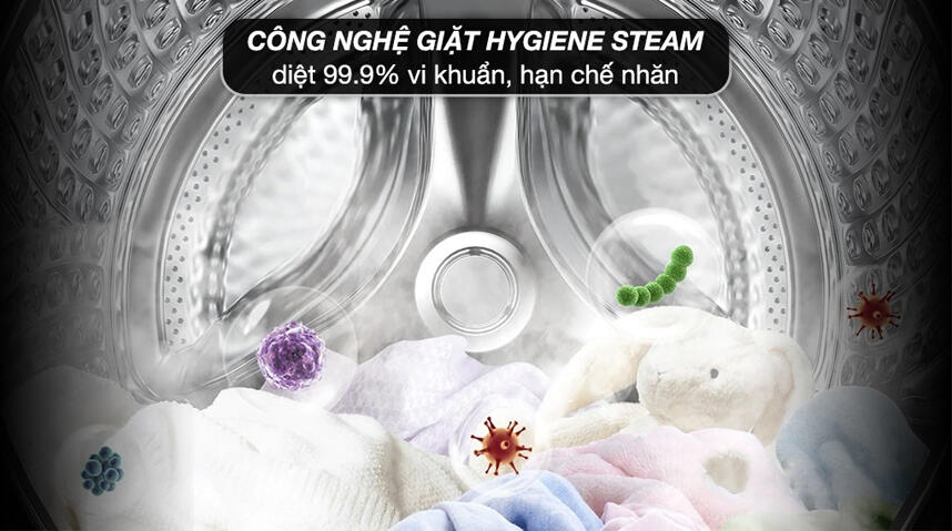 - Giặt hơi nước Hygiene Steam diệt khuẩn đến 99.9%: Hơi nước nhiệt độ cao thẩm thấu sâu vào từng sợi vải, không chỉ giúp loại bỏ vết bẩn cứng đầu mà còn tiêu diệt vi khuẩn và tác nhân gây dị ứng, mang lại sự an tâm cho sức khỏe gia đình.