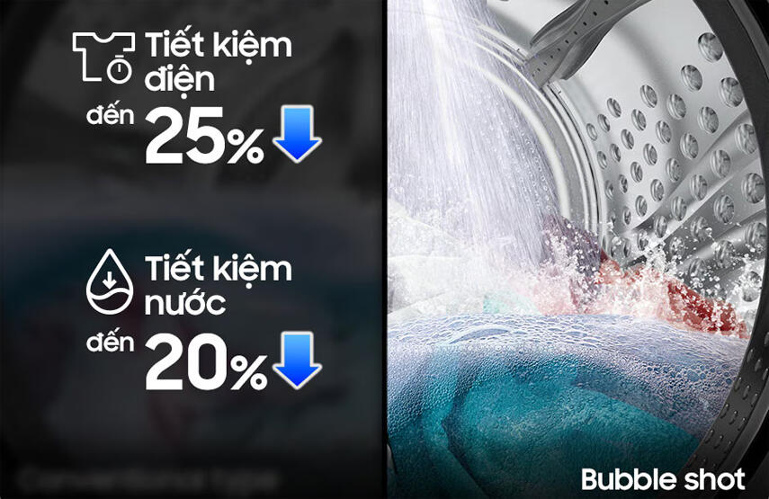 - Chế độ ngâm Bubble Shot sử dụng các tia nước phun mạnh từ phía trên, tăng cường khả năng làm sạch quần áo, đồng thời tiết kiệm thời gian và tài nguyên. Nhờ cơ chế này, máy có thể tiết kiệm đến 20% lượng nước, rút ngắn thời gian giặt đến 25% và giảm tiêu thụ điện năng, mang lại trải nghiệm giặt giũ nhanh chóng và tiết kiệm.