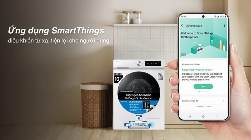 - Kết nối với ứng dụng SmartThings cho phép điều khiển máy từ xa, nhận thông báo trạng thái hoạt động và tối ưu hóa điện năng tiêu thụ thông qua chế độ AI Energy.