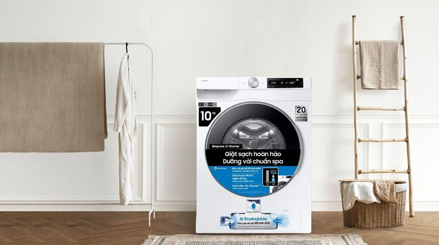 - Công nghệ bong bóng siêu mịn AI EcoBubble sử dụng cảm biến thông minh để nhận biết chất liệu vải, từ đó tự động điều chỉnh lượng bong bóng, thời gian giặt, nhiệt độ nước và tốc độ vắt phù hợp. Nhờ đó, máy tăng khả năng loại bỏ vết bẩn đến 24% mà không cần dùng nước nóng, tiết kiệm đến 70% điện năng và bảo vệ sợi vải tốt hơn 45%.
