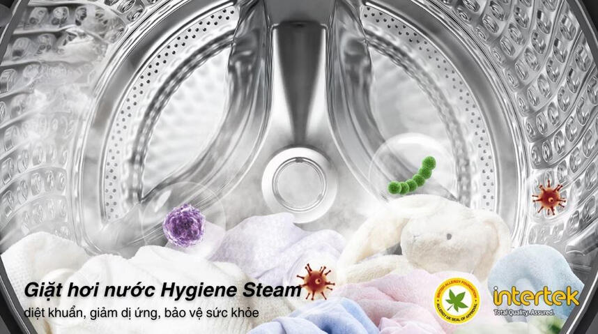 - Giặt hơi nước Hygiene Steam: Hơi nước nhiệt độ cao thổi đều vào toàn bộ bề mặt và sâu bên trong từng sợi vải, giúp loại bỏ cặn bẩn bám sâu và tiêu diệt đến 99,9% vi khuẩn cùng các tác nhân gây dị ứng, mang lại sự an toàn và bảo vệ sức khỏe cho cả gia đình.