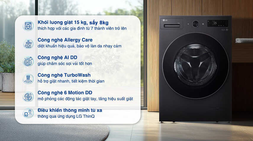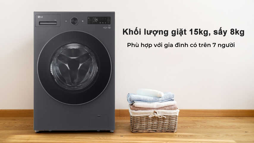 - Máy giặt sấy LG Inverter F2515RNTG sở hữu khối lượng giặt 15 kg và sấy 8 kg, phù hợp với nhu cầu giặt giũ của gia đình có trên 7 thành viên hoặc những hộ thường xuyên giặt nhiều quần áo trong một lần. Với khả năng giặt và sấy tích hợp, máy mang lại sự tiện lợi vượt trội, tiết kiệm thời gian và công sức, đặc biệt hữu ích trong những ngày thời tiết ẩm ướt hoặc không có điều kiện phơi đồ.