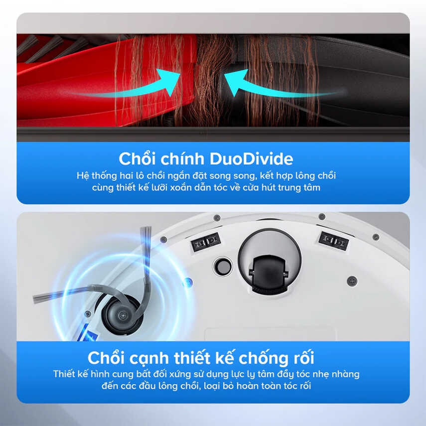 - Chổi chính DuoDivide được thiết kế với hai lô chổi ngắn đặt song song với nhau, kết hợp với lưỡi xoắn đặc biệt, giúp dẫn tóc và bụi bẩn trực tiếp về cửa hút trung tâm. Nhờ có lực hút mạnh mẽ lên đến 12.000 Pa, tóc và bụi sẽ được xử lý một cách nhanh chóng, hạn chế tối đa tình trạng mắc kẹt.