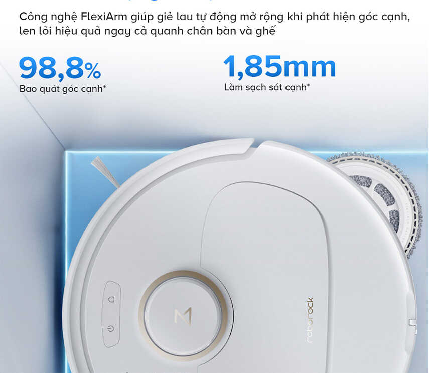 - Giẻ lau sẽ tự động mở rộng khi phát hiện góc cạnh, dễ dàng len lỏi vào chân bàn, ghế và các khu vực khó tiếp cận. Với tỷ lệ bao phủ lên tới 98.8% sát góc, chỉ còn 1.85mm khoảng cách so với cạnh tường, robot đảm bảo bề mặt sàn được làm sạch tối ưu và toàn diện.