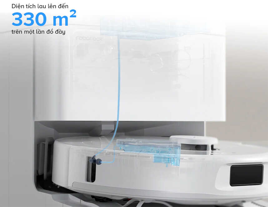 - Tự động bơm nước lên robot, đế giặt giẻ có thể tháo rời: Với đế sạc thông minh, robot có thể tự động bơm đầy bình chứa nước bất cứ khi nào gần cạn, giúp quá trình lau nhà diễn ra liên tục lên đến 330m² mà không cần tiếp nước thủ công. Dock sạc có thể tháo rời phần đế giặt, giúp người dùng dễ dàng làm sạch và hạn chế tình trạng tích tụ bùn đất theo thời gian. Ngoài ra, bộ lọc lớn nâng cấp cũng giúp giảm thiểu tình trạng tắc nghẽn, duy trì hiệu suất hút mạnh mẽ.