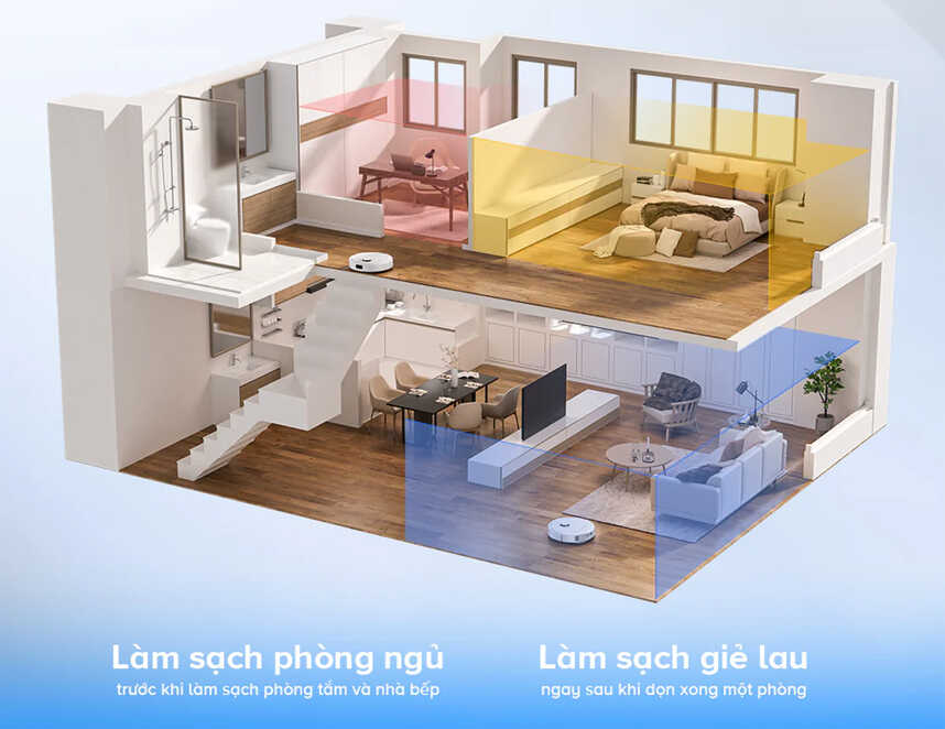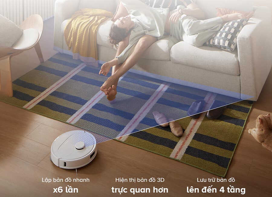 - Lưu trữ bản đồ đa tầng (tối đa 4 tầng): Robot có thể nhận diện và lưu trữ tối đa 4 bản đồ khác nhau, lý tưởng cho những ngôi nhà nhiều tầng mà không cần thiết lập lại mỗi lần di chuyển