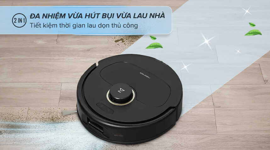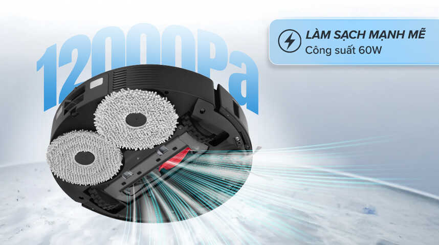 - Vừa hút vừa lau tiện lợi nhờ thiết kế hai giẻ lau tròn, nhanh chóng lau sạch những nơi robot đi qua.