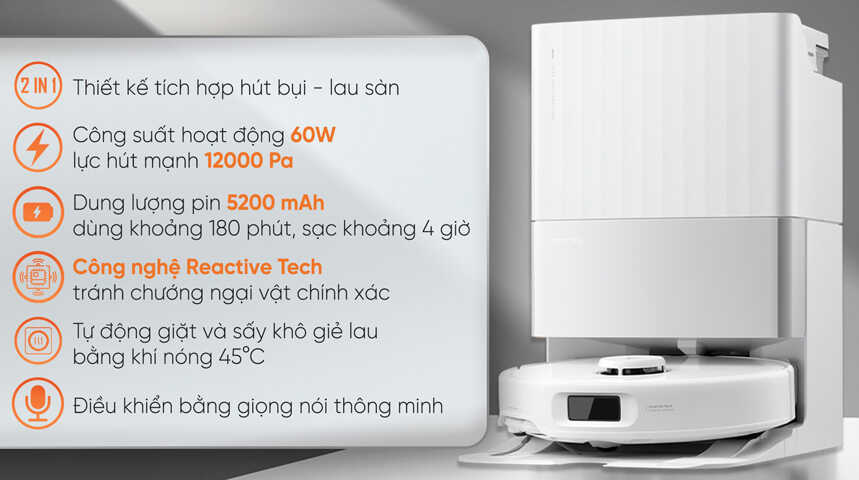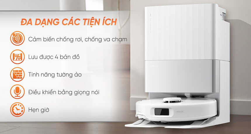 | Tiện ích: | Cảm biến chống rơi, chống va chạm Điều khiển qua kết nối trên điện thoại thông minh Tự động đổ bụi, giặt, sấy khô vải lau Tự quay về đế/trạm sạc Lưu được 4 bản đồ Tính năng tường ảo Vừa hút vừa lau nhà Điều khiển bằng giọng nói Hẹn giờ |
