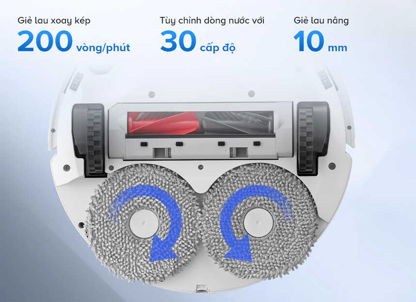 Hệ thống giẻ lau xoay kép với tốc độ 200 vòng/phút giúp xử lý hiệu quả các vết bẩn cứng đầu, từ sàn gạch men bóng đến những bề mặt gồ ghề. Cơ chế xoay – chà mạnh mẽ này mang lại hiệu quả làm sạch tương đương việc tự tay chà sát nhiều lần, đảm bảo sàn nhà luôn sáng sạch.