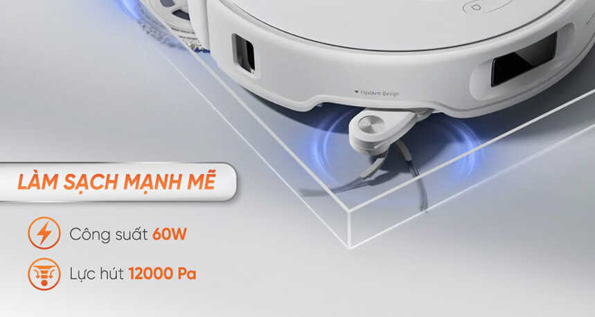 - Sát sao mọi góc cạnh: Công nghệ FlexiArm giúp giẻ lau tự động mở rộng khi tiếp cận các góc cạnh, bao quát đến 98,8%, len lỏi hiệu quả ngay cả quanh chân bàn, ghế hay những khu vực khó tiếp cận, mang lại sàn nhà sạch bóng toàn diện.