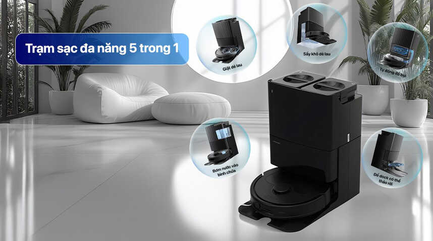 Trạm sạc tích hợp tính năng tự động hút bụi từ robot lên khoang chứa dung tích lớn, giúp bạn rảnh tay nhiều tuần liền mà không cần dọn hộp bụi thủ công. Đồng thời, tính năng tự động bơm nước vào bình chứa đảm bảo robot luôn đủ nước để lau nhà, hạn chế việc phải châm thêm thường xuyên.