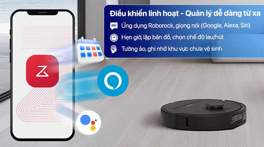 Robot hút bụi có thể điều khiển linh hoạt qua ứng dụng Roborock, bằng giọng nói (Google Assistant, Alexa, Siri) hoặc hẹn giờ theo lịch trình mong muốn. Trên ứng dụng, bạn dễ dàng quản lý từ các tính năng cơ bản đến nâng cao: hẹn lịch làm việc, chế độ làm sạch dọc theo mép tường, lập bản đồ nhanh, tùy chỉnh mức độ lau hút theo từng khu vực. Giao diện thân thiện giúp thao tác trở nên đơn giản và tiện lợi.