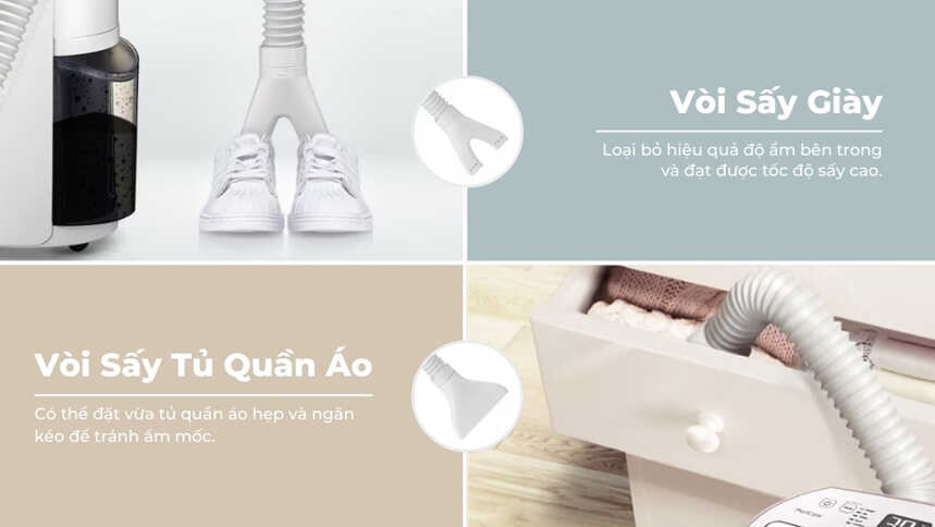 Tích hợp vòi chuyên dụng nhằm hút ẩm giày, quần áo hiệu quả nhất.