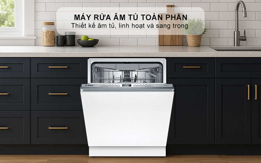 Máy rửa bát Bosch SMV4HCX19E Series 4 được thiết kế tinh tế với kiểu dáng âm tủ hoàn toàn, giúp đồng bộ tuyệt đối với nội thất bếp. Nhờ đặc điểm này, mặt trước của máy không có màu sắc riêng mà được ốp cánh tủ theo phong cách của gia chủ, mang lại sự hài hòa, liền mạch và sang trọng cho không gian bếp hiện đại.