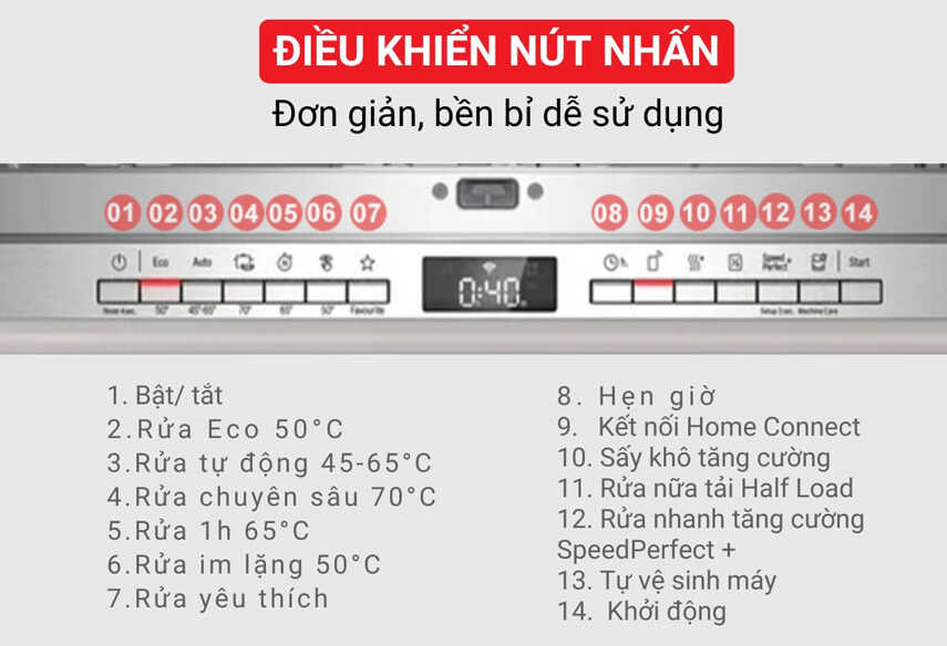 2. Rửa tự động 45-65°C: tự động điều chỉnh nhiệt độ và thời gian rửa dựa trên mức độ bẩn của đồ dùng, giúp tối ưu hóa hiệu quả rửa mà không cần phải lựa chọn thủ công.