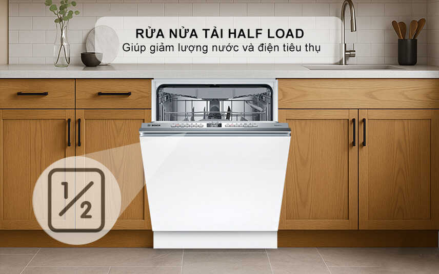 Máy rửa bát âm toàn phần Bosch SMV4HCX19E Series 4 được trang bị tính năng Half Load (Rửa nửa tải) lý tưởng khi chỉ cần rửa một khối lượng nhỏ dụng cụ, như một vài chiếc đĩa hay ly sau bữa ăn nhẹ.