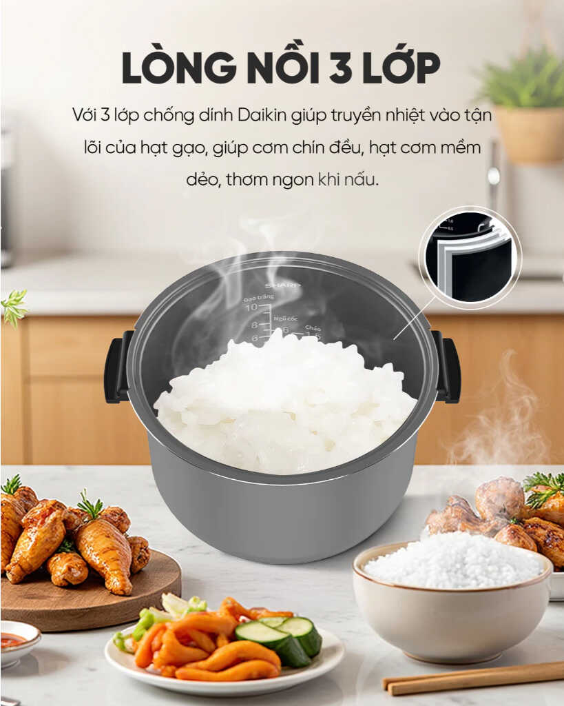 Lòng nồi 3 lớp phủ chống dính Daikin cao cấp, giúp truyền nhiệt nhanh và đều đến từng hạt gạo. Nhờ vậy, cơm chín tơi xốp, hạt cơm mềm dẻo, thơm ngon, không lo bị cháy dính. Lòng nồi bền bỉ, dễ vệ sinh, mang đến sự tiện lợi tối đa cho người dùng.
