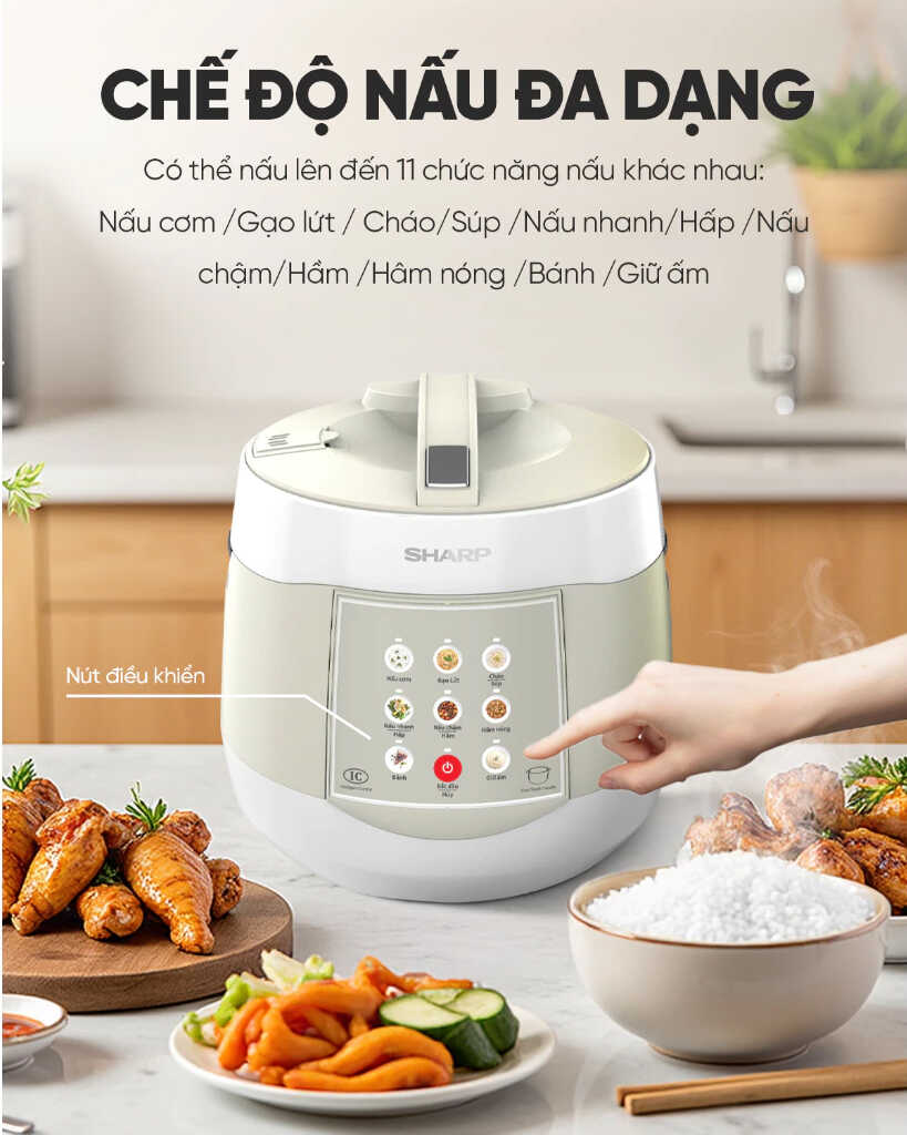 Sharp KS-COM1875I-RS mang đến sự tiện lợi với 11 chế độ nấu đa dạng như nấu cơm, gạo lứt, cháo, súp, nấu nhanh, hấp, nấu chậm, hầm, hâm nóng, làm bánh và giữ ấm. Chỉ với một chiếc nồi, bạn dễ dàng chế biến nhiều món ăn ngon, dinh dưỡng cho cả gia đình, tiết kiệm thời gian mà vẫn đảm bảo hương vị trọn vẹn.