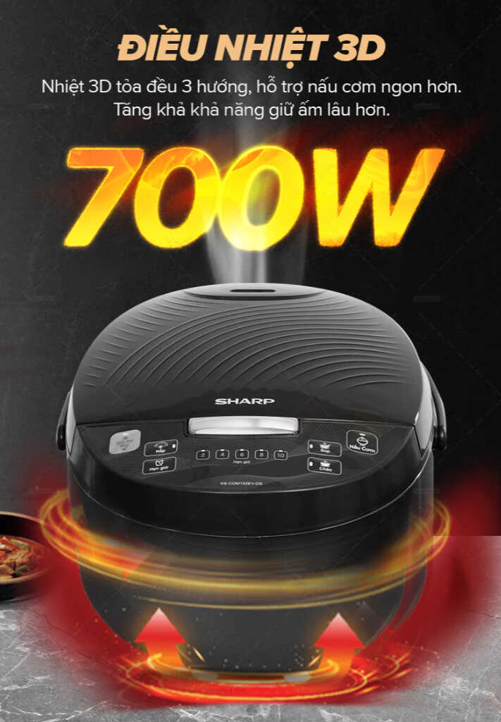 Công nghệ điều nhiệt 3D cùng công suất 700W: Tỏa nhiệt đều khắp 3 hướng, giúp hạt cơm chín đều, dẻo thơm và giữ ấm lâu hơn mang đến bữa cơm trọn vẹn và ấm áp cho cả gia đình.