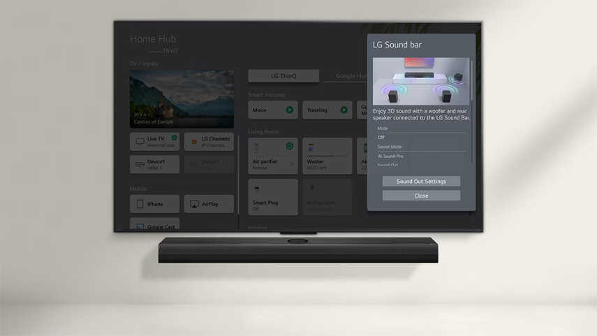 - LG Soundbar cho phép đồng bộ hoàn hảo giữa tivi và loa thanh LG, giúp mở rộng không gian âm thanh và tối ưu hiệu suất phát. Nhờ sự kết hợp này, chất âm được tái tạo trung thực, lan tỏa mạnh mẽ và giàu chiều sâu, góp phần nâng tầm trải nghiệm giải trí tại gia trở nên sống động và ấn tượng hơn.