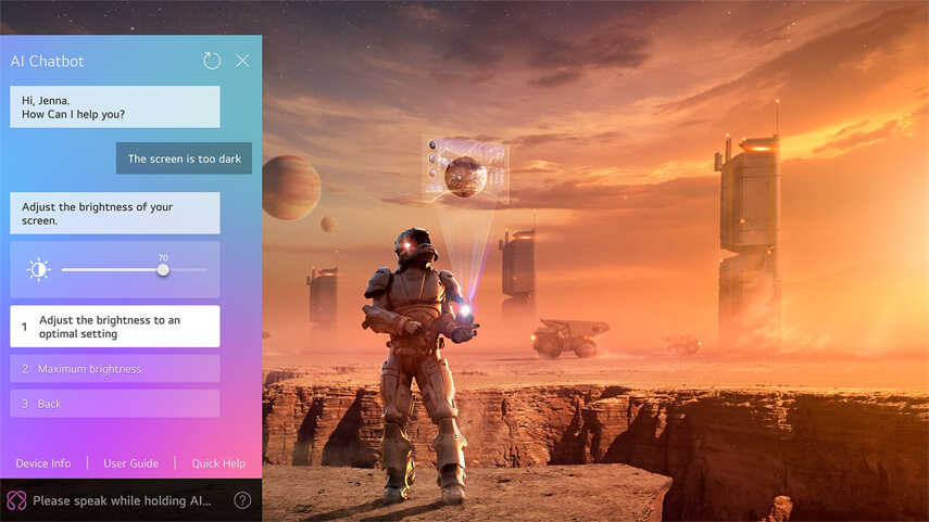 - AI Chatbot giúp bạn hỏi đáp tức thì qua Điều khiển AI Magic. TV sẽ thấu hiểu yêu cầu của bạn và phản hồi ngay lập tức, từ việc cài đặt đến khắc phục sự cố, mang lại trải nghiệm liền mạch và tiện lợi.
