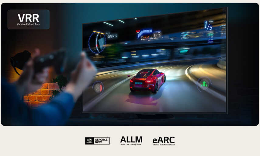 - Tivi trang bị công nghệ HGiG và ALLM giúp giảm độ trễ đầu vào xuống mức tối thiểu, mang lại phản hồi nhanh chóng và mượt mà trong từng thao tác. HGiG tối ưu chất lượng hình ảnh theo tiêu chuẩn game HDR, còn ALLM tự động chuyển sang chế độ chơi game khi phát hiện kết nối console. Nhờ đó, bạn có thể tận hưởng trải nghiệm chơi game chính xác, chân thực và đầy hứng khởi.