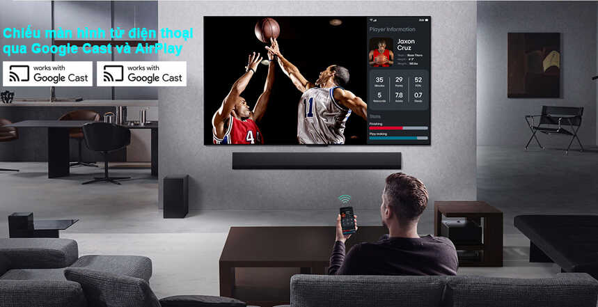 - Tính năng AirPlay 2, Google Cast cho bạn chọn nội dung muốn xem trên điện thoại, kết nối và truyền phát nó lên tivi LG để xem các chi tiết thêm to rõ, nghe nhạc hấp dẫn hơn.