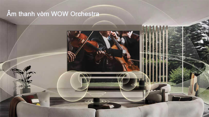 Công nghệ WOW Orchestra cho phép TV LG và soundbar hoạt động đồng bộ, kết hợp sức mạnh âm thanh từ cả hai thiết bị. Nhờ đó, hệ thống mở rộng độ sâu, độ rộng và hướng âm, tạo nên hiệu ứng âm thanh vòm bao trùm không gian. Âm thanh trở nên sống động, cân bằng và giàu chi tiết hơn, mang đến trải nghiệm nghe đắm chìm như đang ở rạp chiếu phim thực thụ.