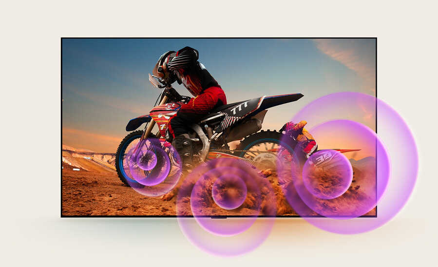 - Tivi tích hợp hệ thống loa công suất 40W cùng công nghệ Dolby Atmos và α9 AI Sound Pro, mô phỏng hiệu ứng âm thanh vòm, tạo trải nghiệm âm thanh sống động bao phủ cả căn phòng.