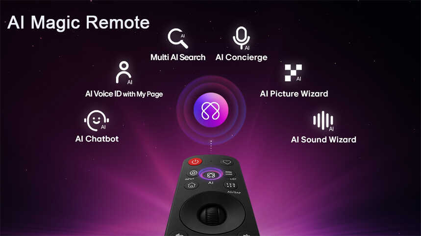 - AI Magic Remote, cho phép mở khóa mọi trải nghiệm AI chỉ với một nút bấm chuyên dụng. Người dùng có thể nhanh chóng truy cập các tính năng AI, tìm kiếm nội dung hoặc điều chỉnh cài đặt dễ dàng. Kết hợp bánh xe cuộn thông minh và điều khiển giọng nói, mọi thao tác từ chọn phim, mở ứng dụng đến ra lệnh cho tivi đều trở nên nhanh chóng, trực quan và tiện lợi hơn mỗi ngày.