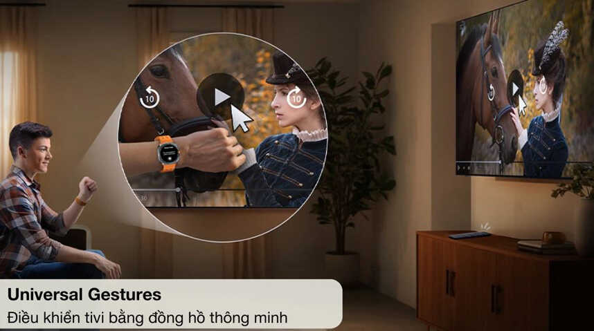 - Universal Gestures khi kết hợp giữa Galaxy Watch (Watch 4 trở lên) và tivi Samsung mang lại cách điều khiển thông minh và không cần dùng điều khiển từ xa — đặc biệt tiện dụng khi remote không dễ tìm hoặc khi bạn đang bận rảnh tay.
