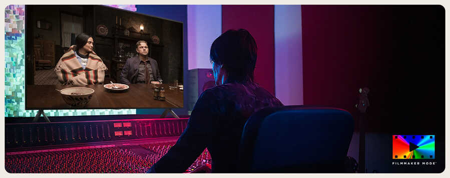 - Ambient FILMMAKER MODE cho trải nghiệm điện ảnh đỉnh cao ngay tại nhà. Công nghệ này tự động điều chỉnh độ sáng theo ánh sáng xung quanh, giúp tái hiện chất lượng hình ảnh chuẩn xác, đúng với ý đồ của các nhà làm phim, mang lại cảm giác như đang xem phim tại rạp.