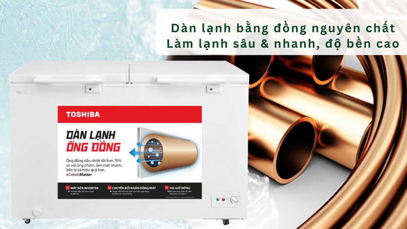Thiết kế ống đồng trên tủ đông Toshiba GR-RC265CM mang lại nhiều lợi ích vượt trội, giúp nâng cao hiệu suất hoạt động và độ bền của sản phẩm. Nhờ khả năng dẫn lạnh nhanh và hiệu quả, ống đồng giúp tủ đạt được nhiệt độ lý tưởng trong thời gian ngắn, từ đó tiết kiệm điện năng. Bên cạnh đó, chất liệu đồng còn có độ bền cao, chống ăn mòn tốt, góp phần kéo dài tuổi thọ của máy nén và toàn bộ hệ thống làm lạnh.